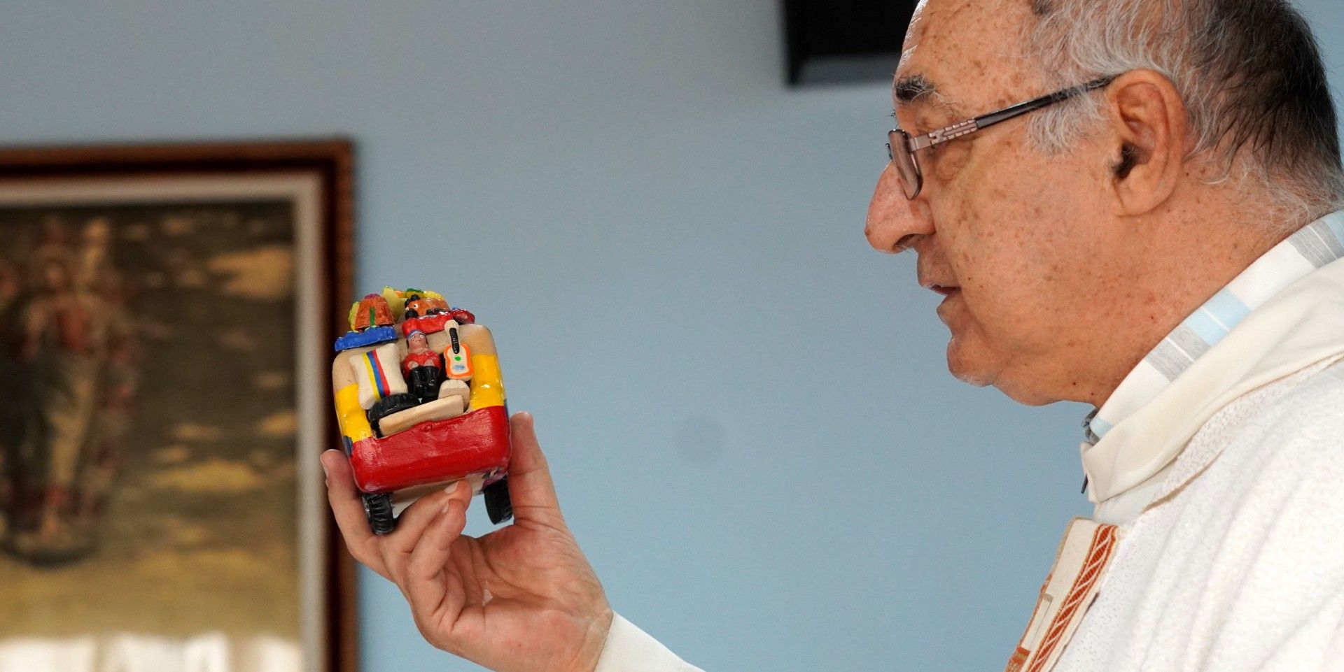 Al final de la celebración, se entregaron regalos de la región de Colombia a la región del Congo: una maqueta de la "Chiva", un autobús descubierto y colorido que los campesinos colombianos utilizan para llevar sus mercancías al mercado, luego un estuche en donde colocar bolsitas de té, hecho de paja de arroz, cuya producción se ha convertido en un elemento importante de la economía colombiana, y por último la camiseta de la selección nacional, que es uno de los signos de identidad colombiana. Terminamos la eucaristía con una invitación a rezar el Ave María, una forma de sentirnos unidos al pueblo colombiano que se caracteriza por una fuerte devoción a la Madre del Señor.